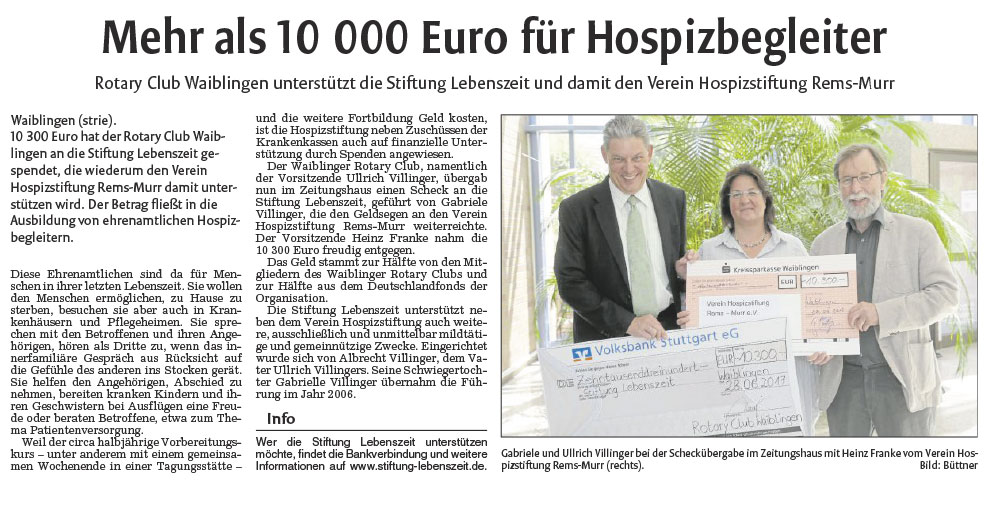 Rotary Club Waiblingen unterstützt die Stiftung Lebenszeit und damit den Verein Hospizstiftung Rems-Murr
