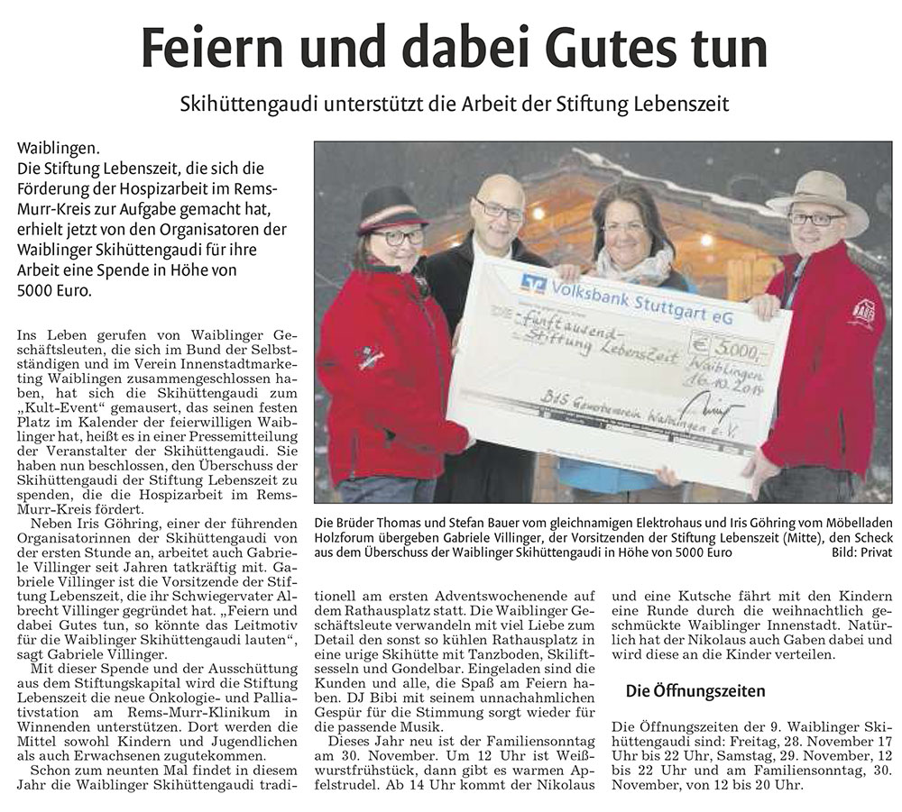 Skihüttengaudi unterstützt die Arbeit der Stiftung LebensZeit